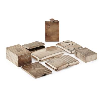 four of typical hinged opening form with engraved decoration; one with embossed floral pattern in art nouveau taste; together with a table cigarette box with reeded detail and hidden hinged vesta case to cover; a Chinese hinged card box and a small hipflask (8)