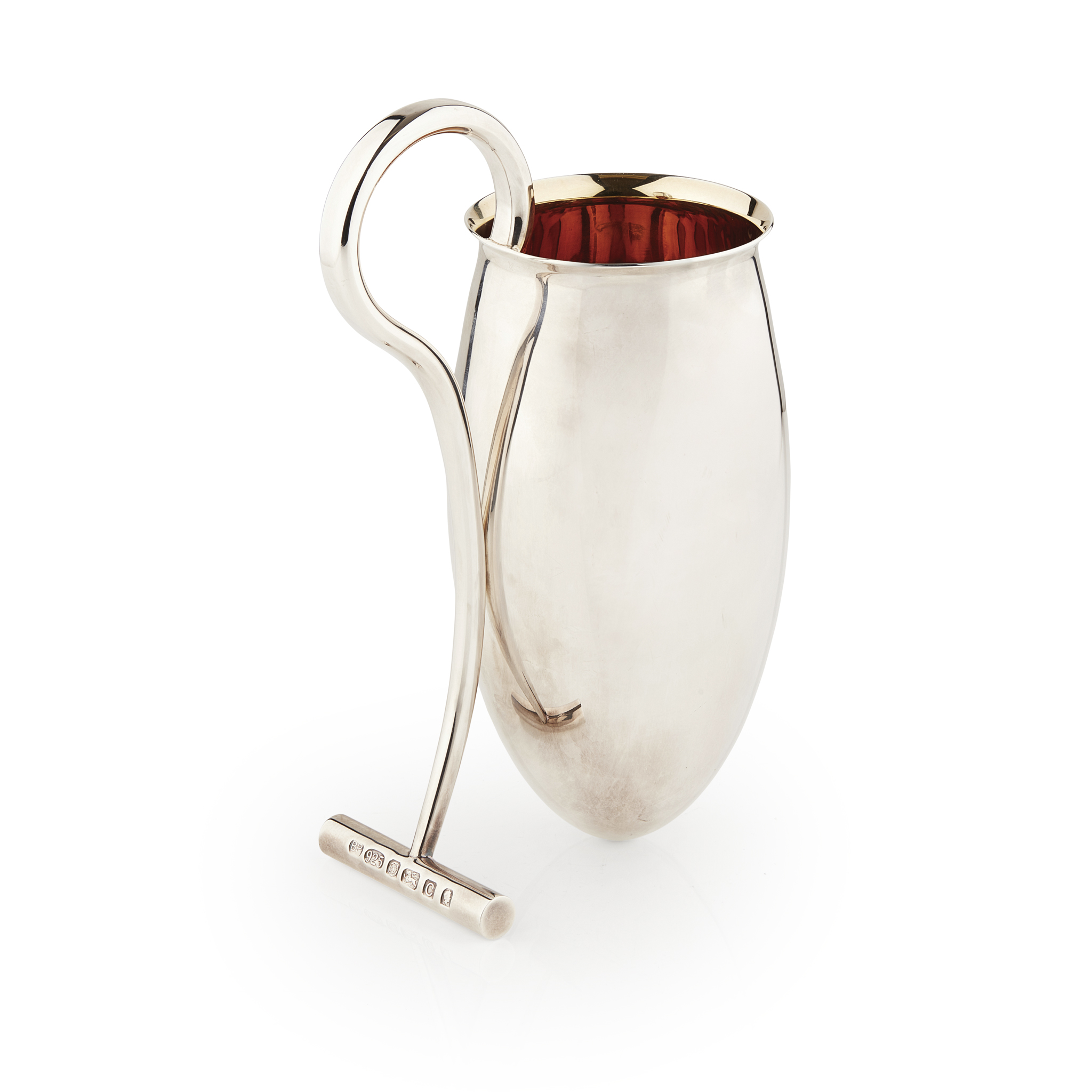 Sheffield 2002, the bowl of tall tapering form, with thick scroll handle and support, feature hallmarks to foot of handle