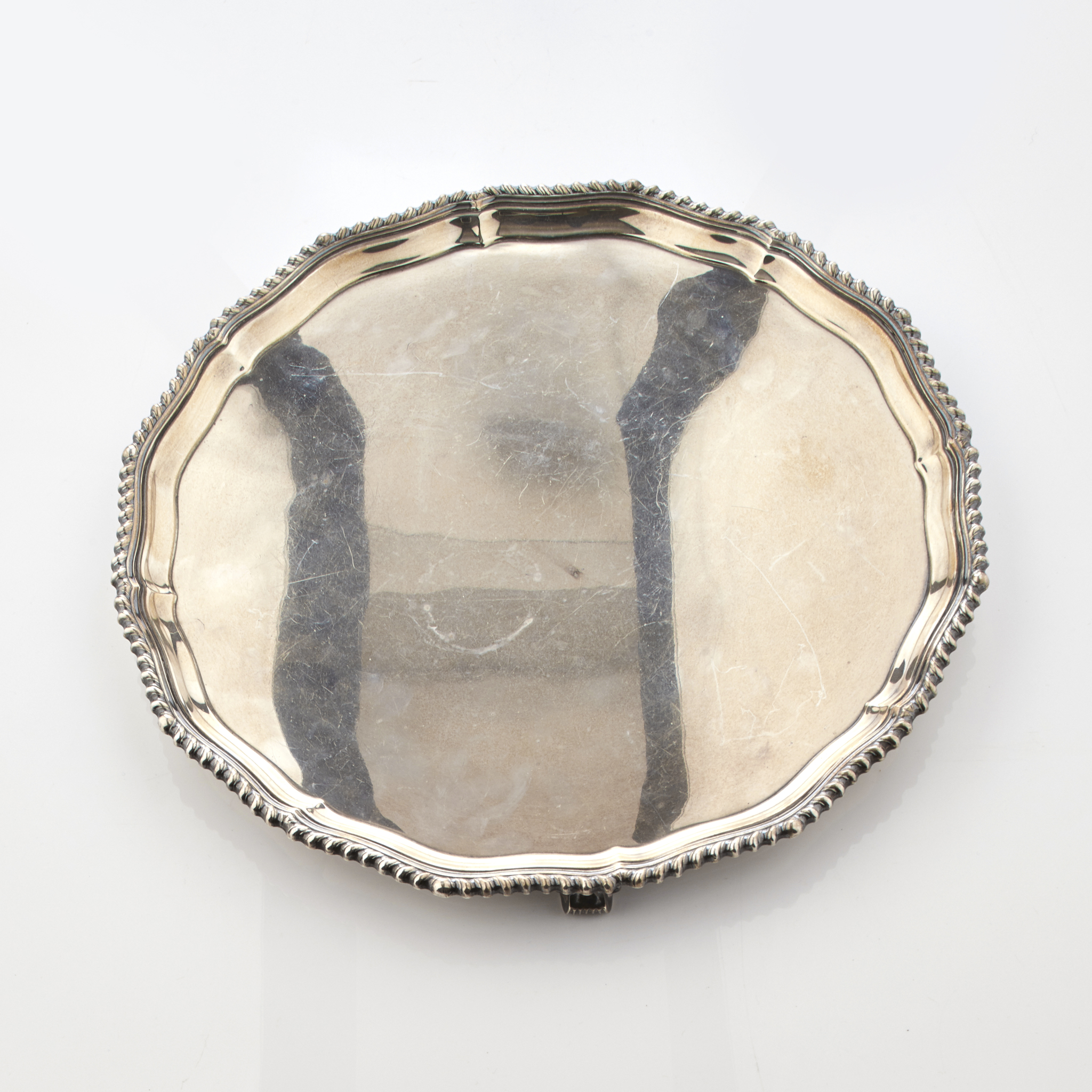 Adie Bothers, Birmingham 1954, of shaped circular outline with gadrooned rim and raised on three scroll feet