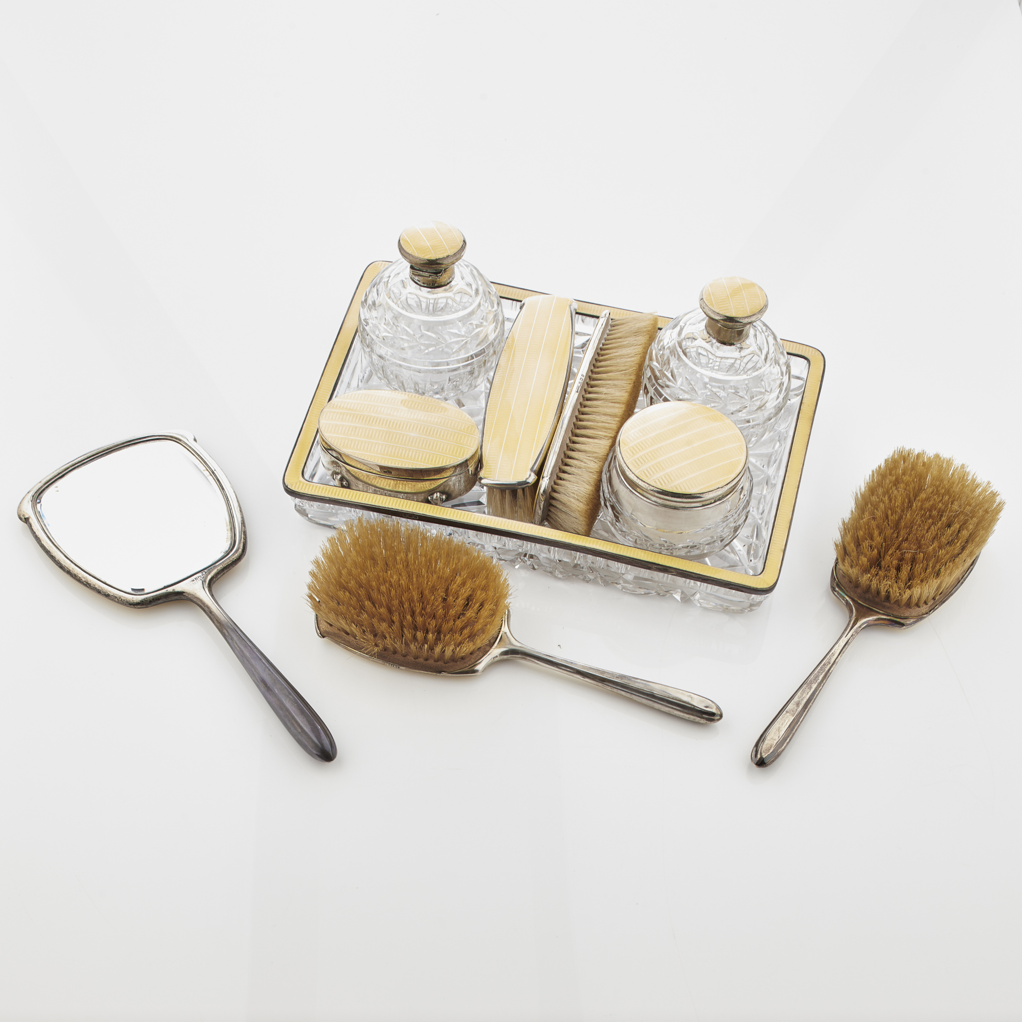 the mounts mid 20th century, with guilloche yellow enamel, comprising; rectangular tray; oval silver box and hinged cover; pair and single mounted bottles; brushes and mirror (11)