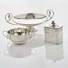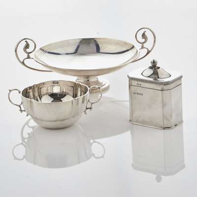 Birmingham 1940, of Roman form, shallow dish scrolling handles, pedestal foot, slight threaded detail, together with a two handled bowl, slight lobed detail and a tea caddy, modern, of canted rectangular form, slight decorated border, leaf clasped ball finial (3)