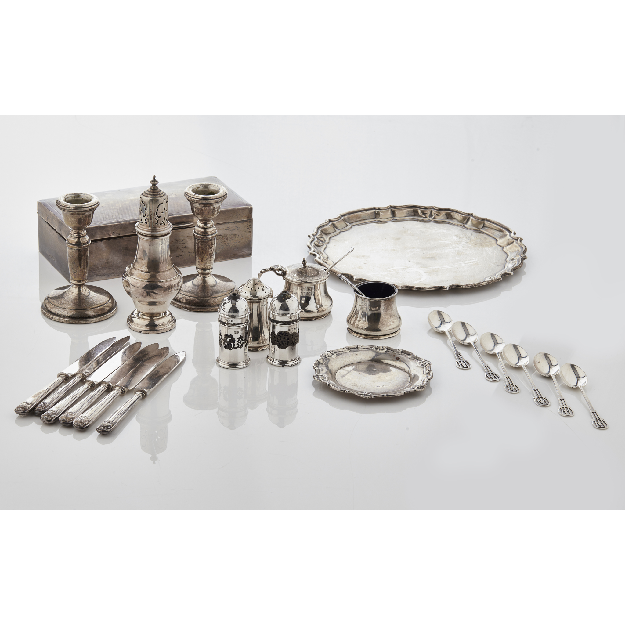 to include a set of six Liberty style coffee spoons, small circular salver; two dwarf candlesticks; a table cigarette box; a condiment set; sugar sifter and fruit knives (qty)