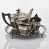 Daniel & Arter, Birmingham 1933, comprising a teapot, sugar bowl and cream jug, of plain baluster from with ribbed detail, plain angular handles; together with a silver plated salver with presentation inscription (4)