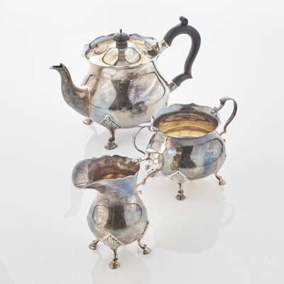 JR, London 1927, of rounded baluster form raised on short cabriole legs with hoof feet, comprising, a teapot, sugar and cream