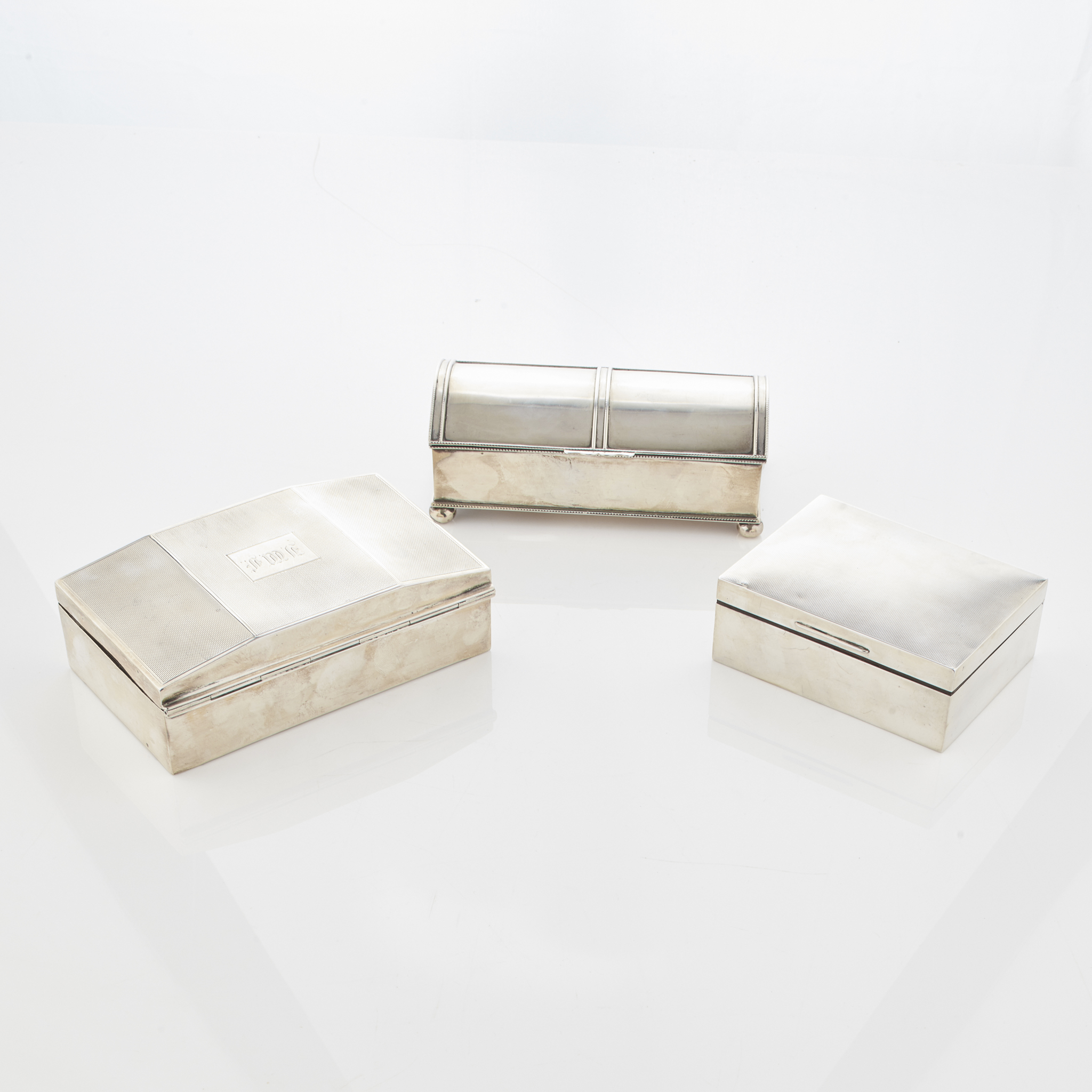 Birmingham 1924, of rectangular form, hinged domed cover with beaded borders; together with two engine decorated table cigarette boxes (3)