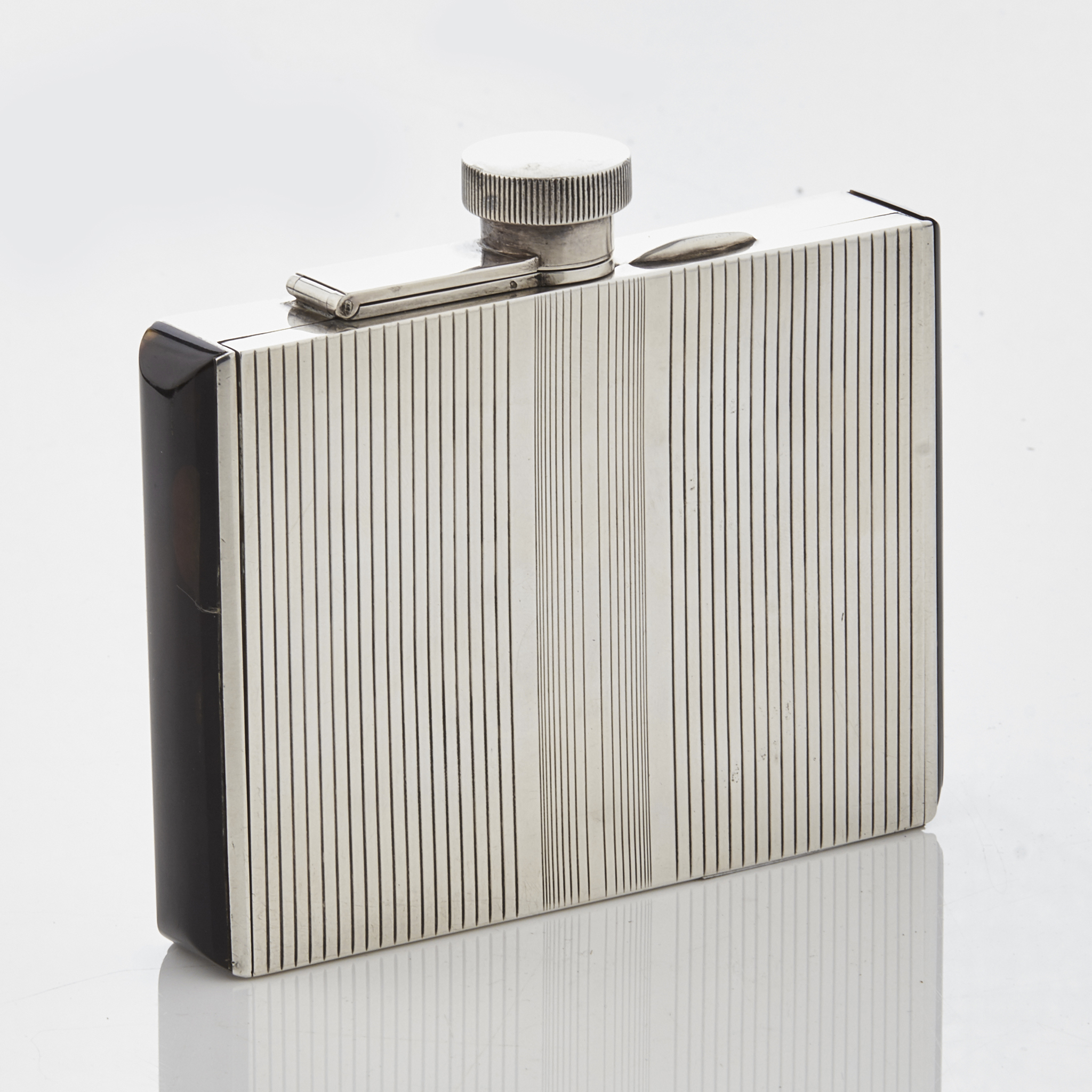 of rectangular outline with line engraved detail to the body, with tortoiseshell detail detail to sides, hinged cigarette compartment to one side with gilt interior, the screw off lid with continental marks