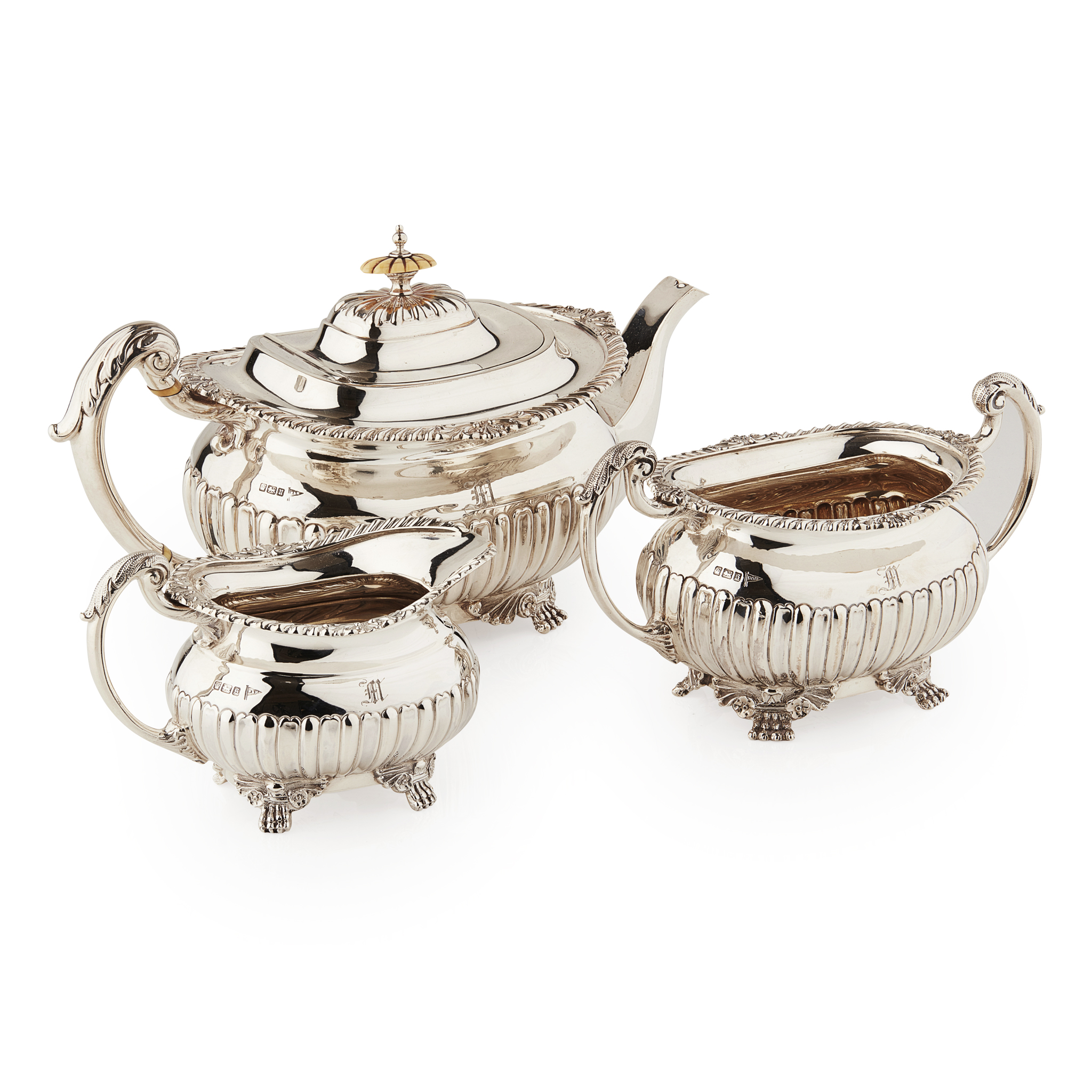 Walker & Hall, Sheffield 1910 and 1912, comprising teapot, twin handled sugar bowl and milk jug, each of slight baluster form with gadrooned lower section and everted gadrooned rim, raised on four paw feet