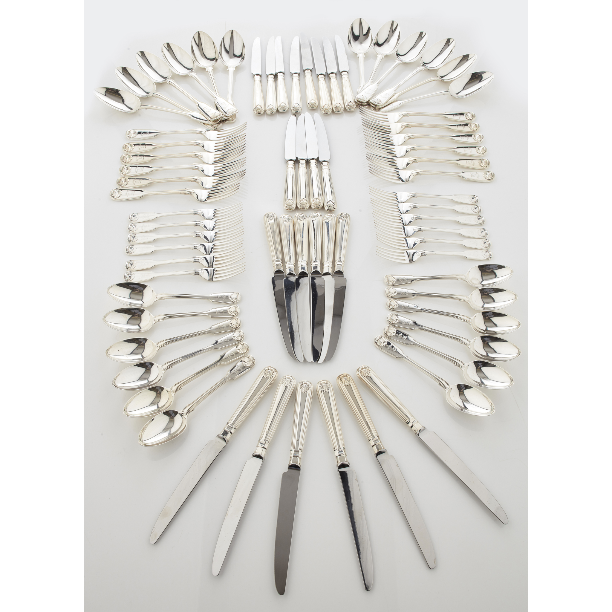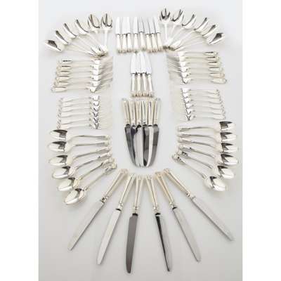 Goldsmiths & Silversmiths Company, London 1905, of single struck Fiddle, Thread and Shell pattern with engraved crest and motto to terminals, comprising twelve each of, tablespoons, table forks, dessert spoons and dessert forks, together with a matched set of modern table and side knives (72)