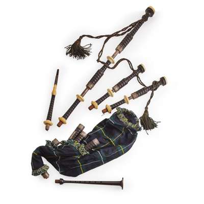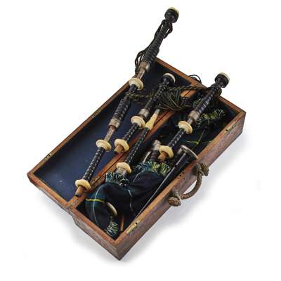 PH, Glasgow 1937, ebony, ivory and silver mounted, tartan bag, engraved decoration to the silver mounts, all contained in case with brass corners and plaque