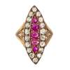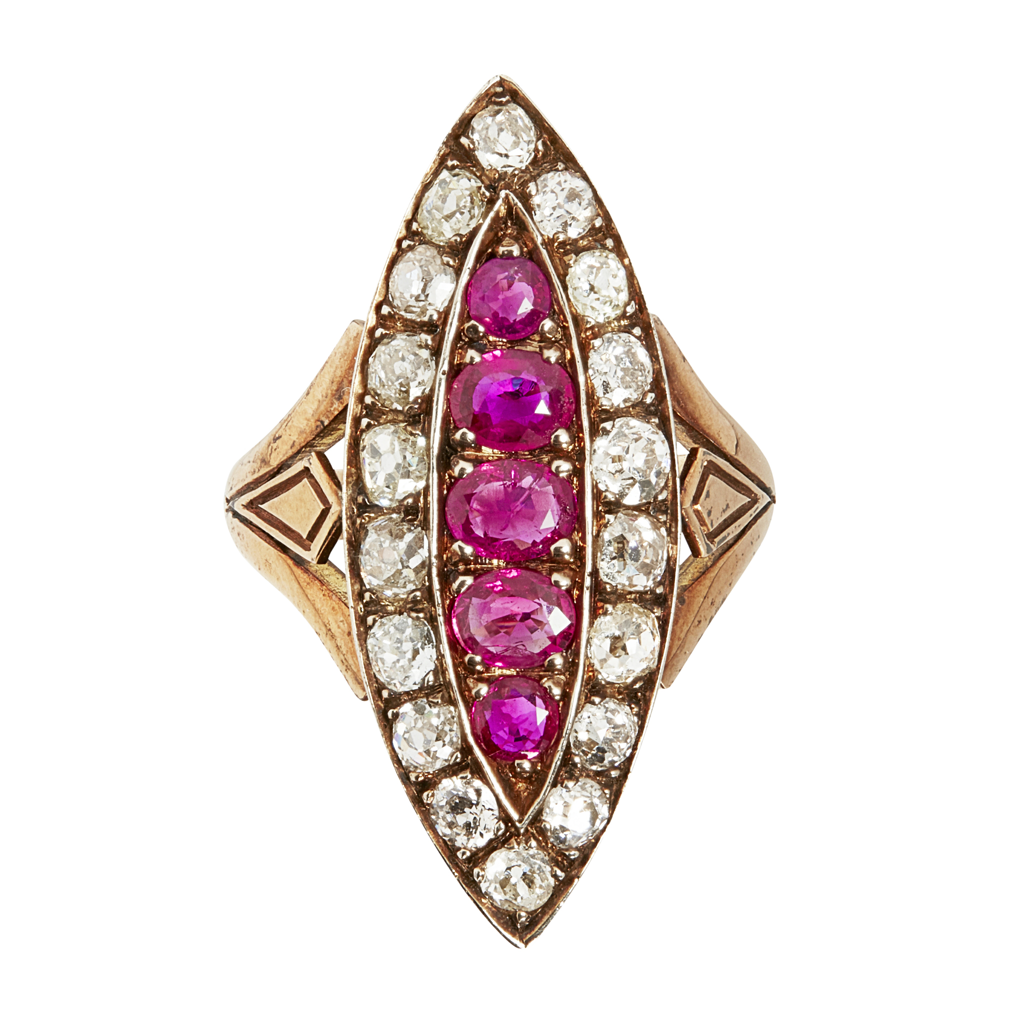 of navette form, claw set with a row of five graduated oval rubies, in a single border of old European cut diamonds, to a plain unmarked yellow metal shank