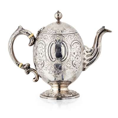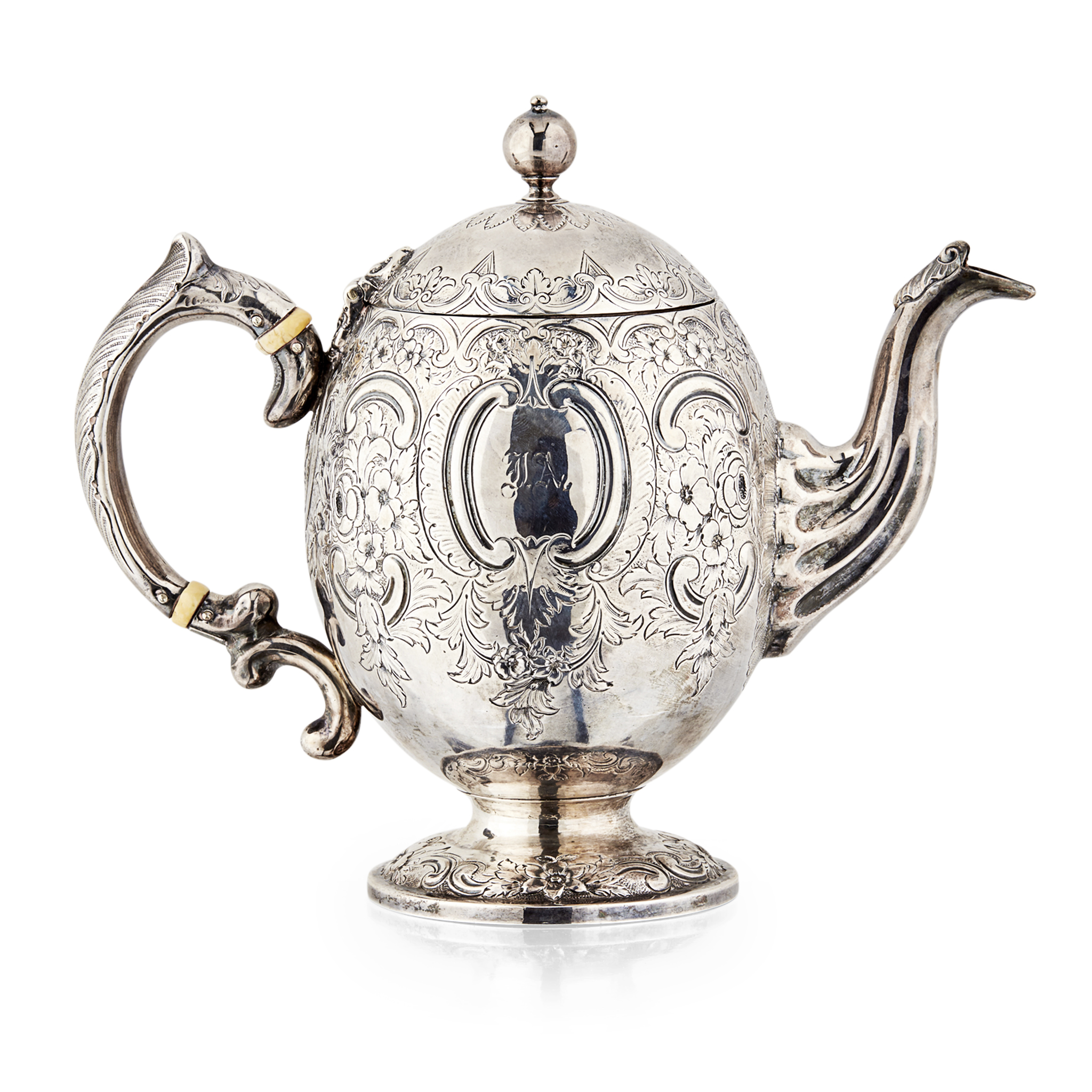 J Hardy, Edinburgh, of ovoid form, profusely chased foliate and flower heads within scroll border, with scroll cartouche with engraved initials