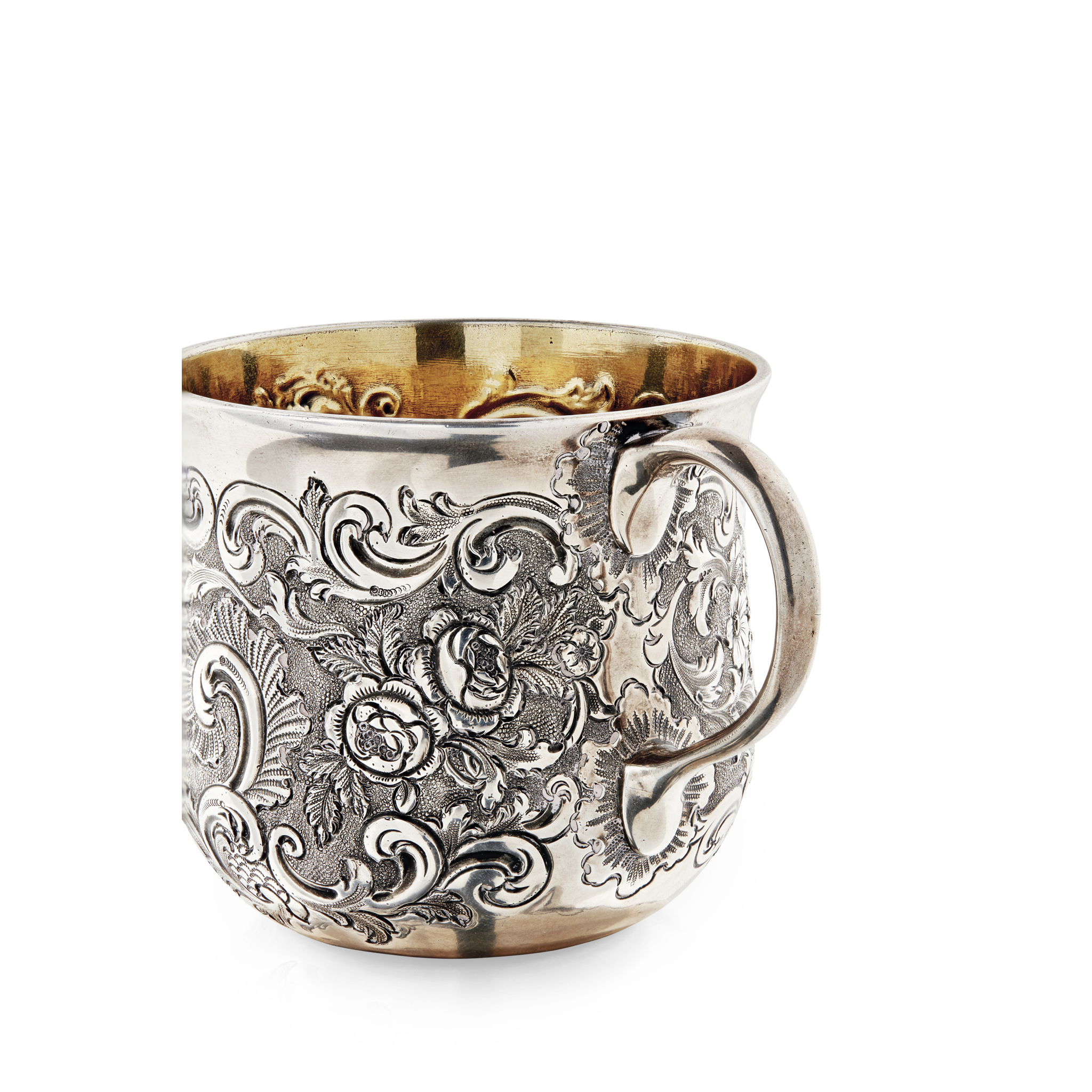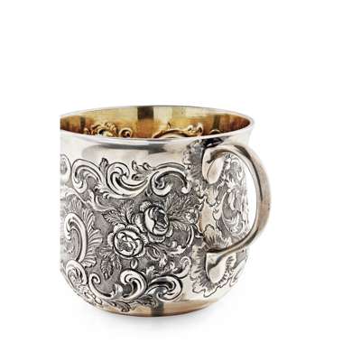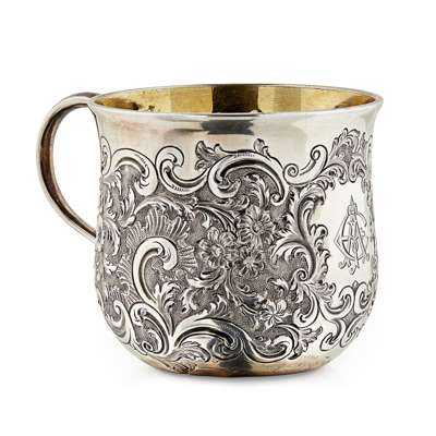 Lothian & Robertson, Edinburgh 1758, Assay Master Hugh Gordon, the body of the mug formed from a converted tumbler cup with finely chased foliate border within scroll cartouches and engraved monogram, engraved to base 'From A and R J M 2nd August 1861', with simple C scroll handle