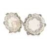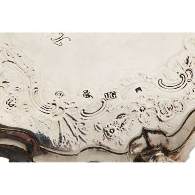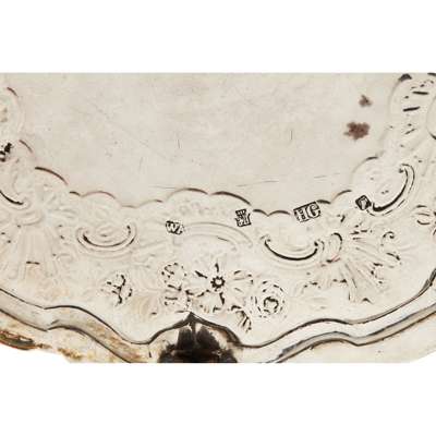 William Auld, Assay master Hugh Gordon, Edinburgh 1748, of shaped circular outline, scroll and shell border, the flat with engraved border, foliate, shell and scrolls, raised on three hoof feet, initialled H to under side of base and with engraved scratch weights (2)