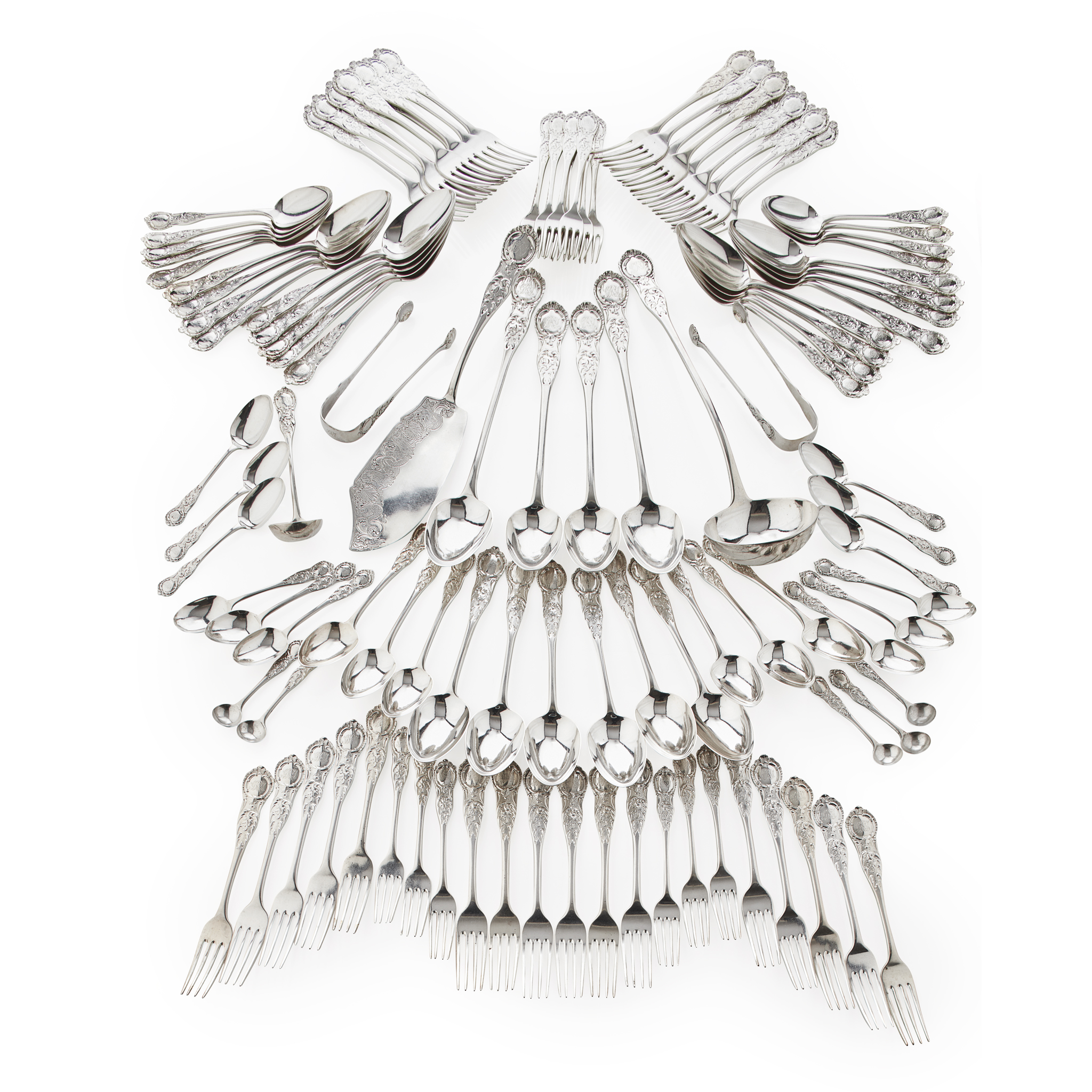 R Gray & Son of Glasgow, various dates, of private die pattern, double struck, comprising: thirty five table forks; twenty three table spoons; soup ladle; fish slice; two large pairs serving spoons and two smaller; sauce ladle; fifteen dessert spoons; two sugar tongs; five condiment spoons; twelve teaspoons; thirteen dessert forks