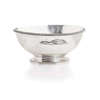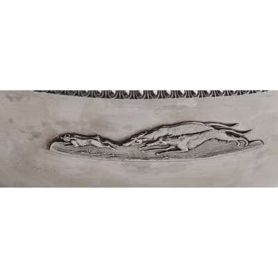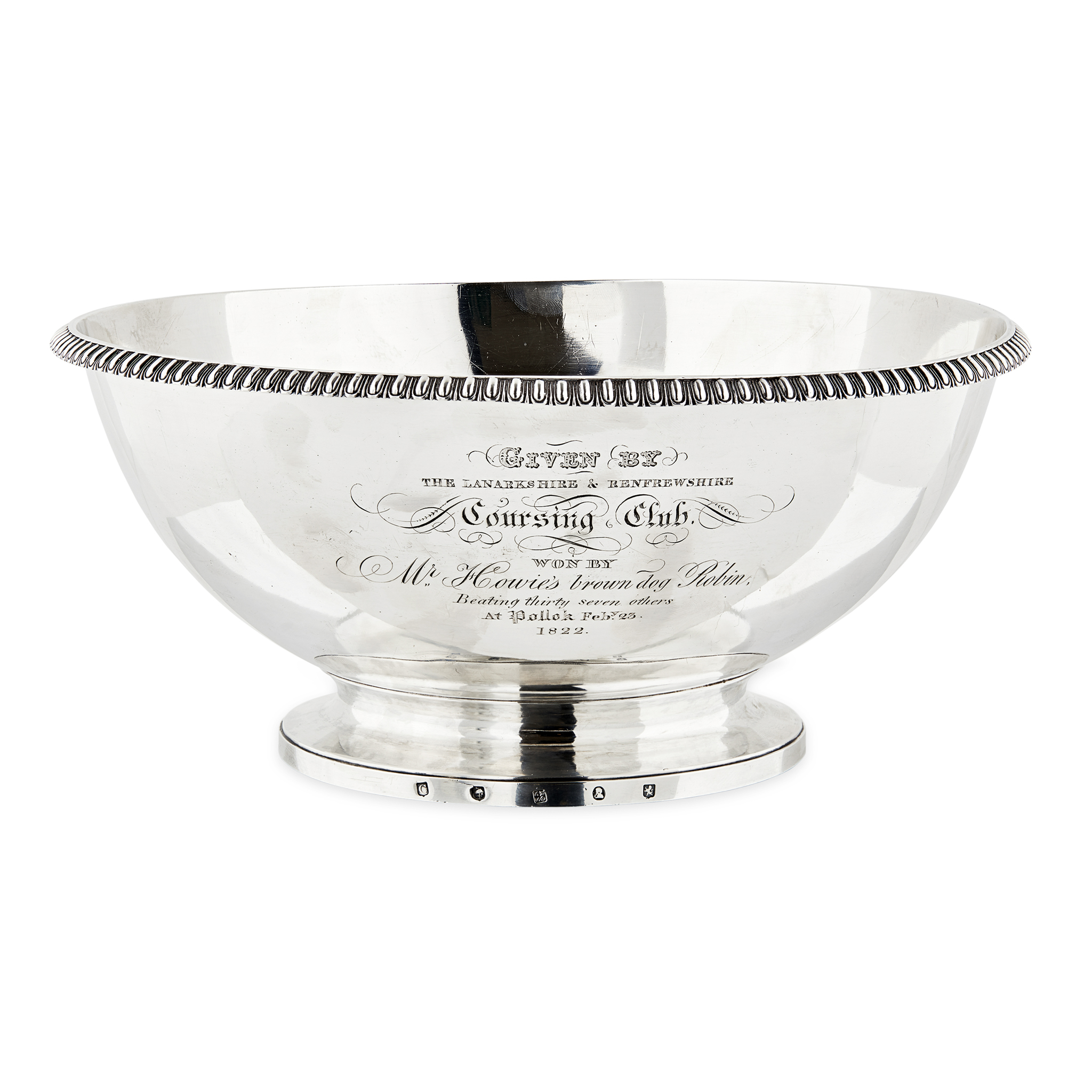 Robert Gray & Sons, Glasgow 1821-22, of simple form with ovolo border to rim, applied with two greyhounds in pursuit, engraved inscription 'Given by the Lanarkshire and Renfrewshire Club, worn by Mr Howies brown dog Robin, beating thirty seven others, at Pollok February 23 1822