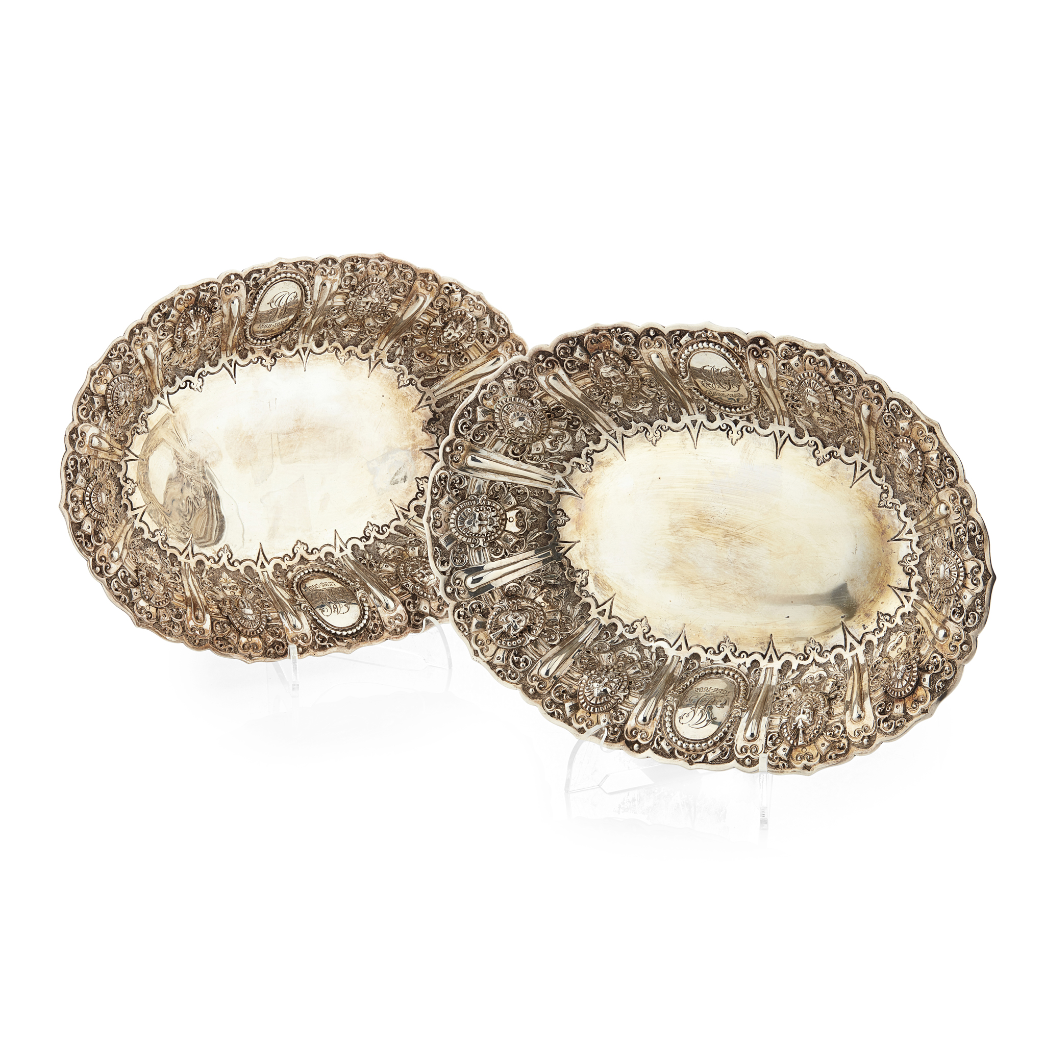 JB, Glasgow 1892, of shaped oval outline with profusely decorated panels of classical masks in foliate and scroll border, with oval cartouches engraved with script initials and dated 1863 - 1893 (2)