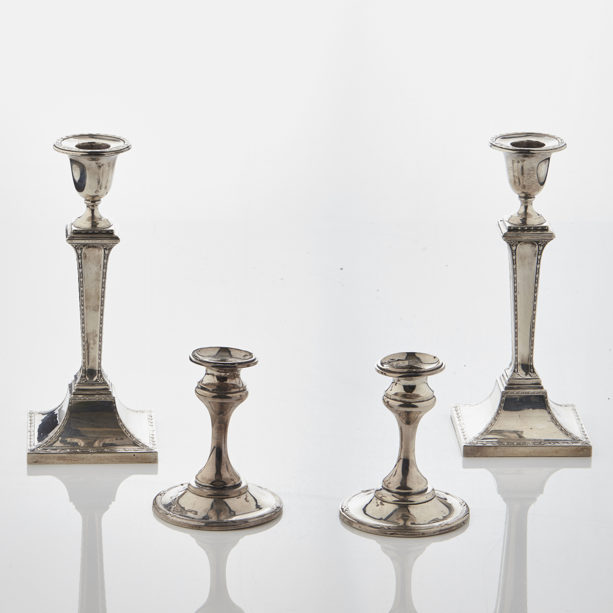 Sheffield 1899, of tapered column with domed square bases with foliate borders and flower head details; together with a dwarf pair of desk candlesticks (4)