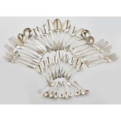 various makers and dates, mainly 19th century, forty pieces, primarily fiddle pattern, various initials and crests