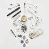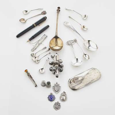 to include an apostle spoon, silver gilt; various condiment spoons, thimbles; a needle case by Samuel Pemberton; 19th century rattle with whistle; silver fobs and a spectacle case, American marked 14K and sterling; fountain pens etc. (qty)