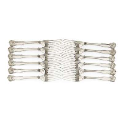 Mary Chawner, London 1836, of double struck hour glass and shell variant with shell heel, each with engraved crest to terminal; together with a set of twelve dessert forks to match by Goldsmiths and silversmiths Company, London 1937 (29)