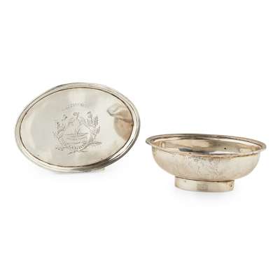 William Thompson, Dublin 1820, comprising an oval wine funnel flat with reeded rim and a tapered oval wine funnel bowl (spout lacking) each engraved with a regimental badge of the Caithness Legion within a thistle spray (2)