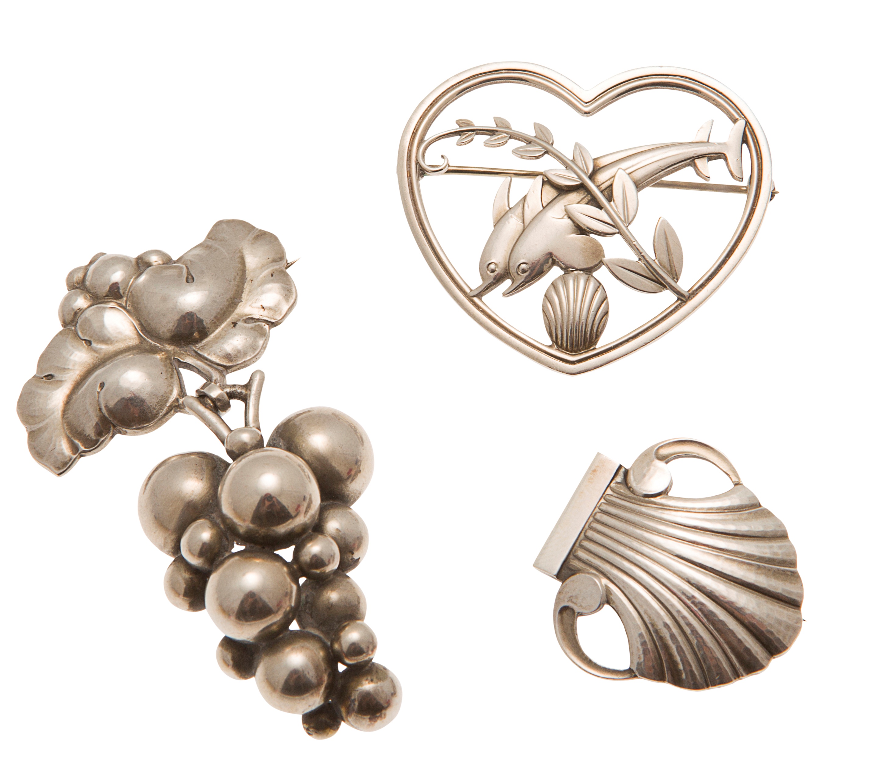 the first modelled as a heart and dolphins, No. 312, marked sterling; the next of scallop shell form, No. 246, marked sterling; Harald Nielsen for Georg Jensen grapes pendant brooch No. 217B, marked sterling (3)