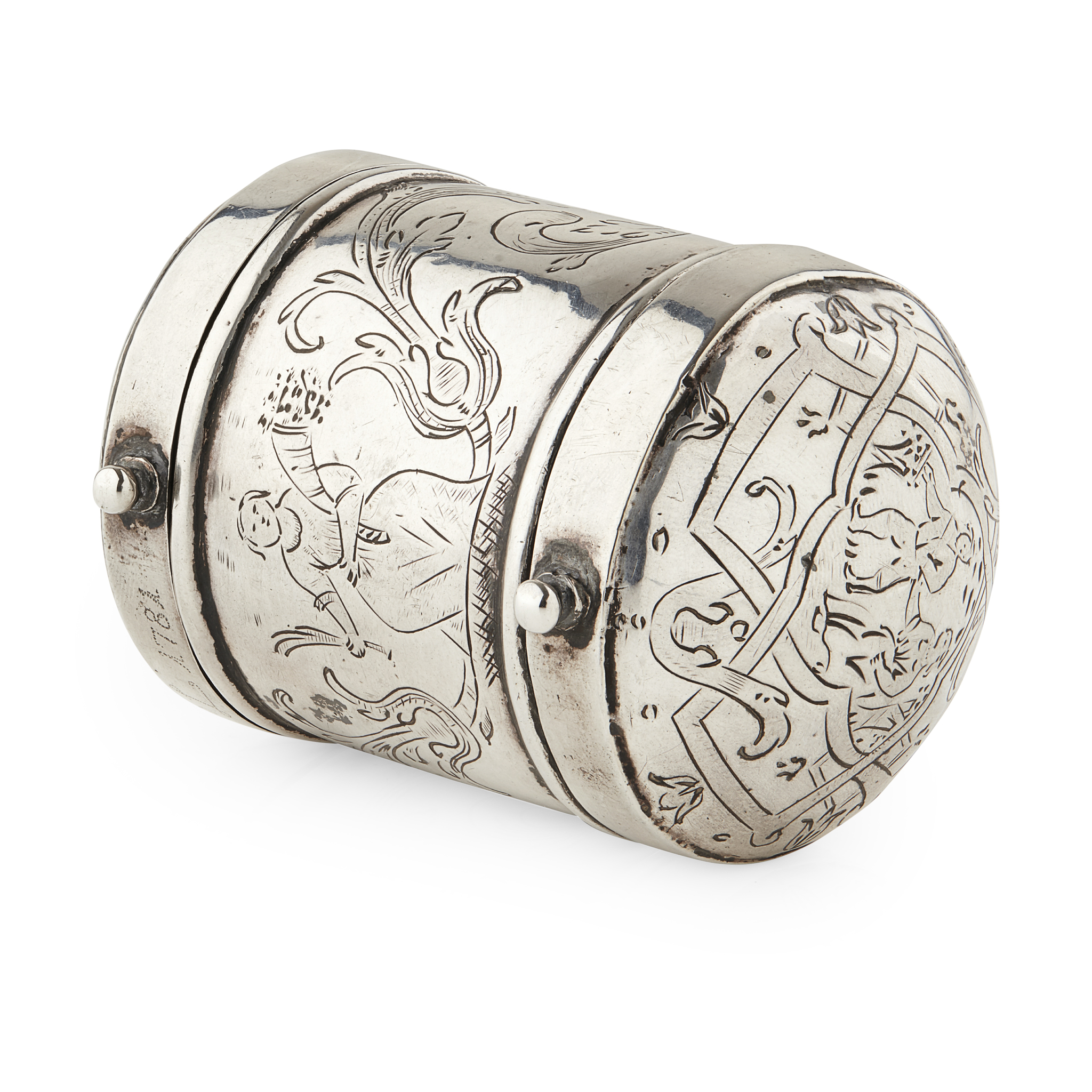 apparently unmarked, of cylindrical form, domed hinged cover, plain collars, each with a small raised knob (for tying?) later dot engraved 'PL 1781' the ends engraved figures and a house, the cylindrical body engraved with central figure of lady holding horn of plenty and sheave of corn, scrolling foliate background