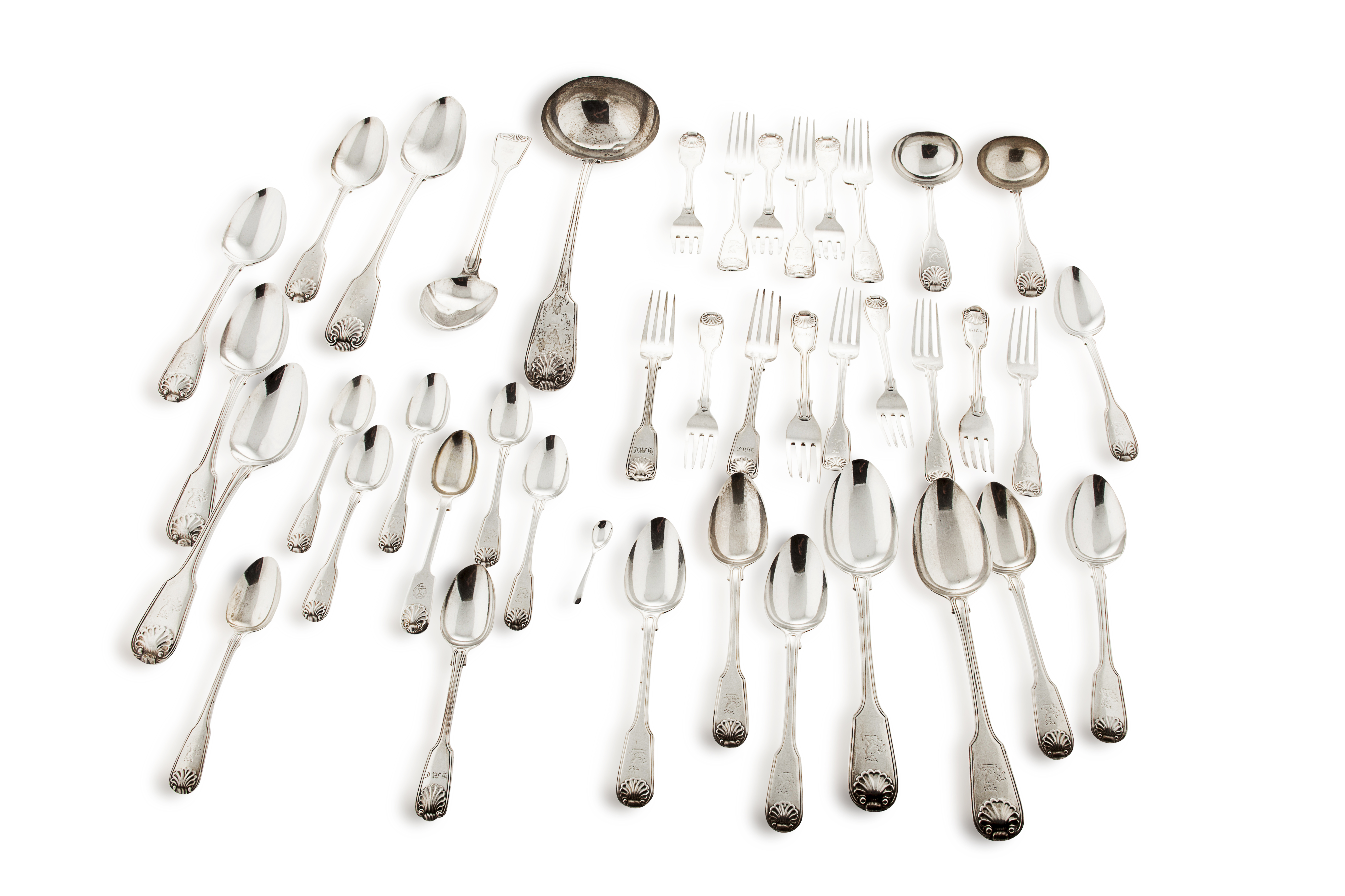 various dates and makers, primarily circa 1800, fiddle thread and shell pattern, single and double struck, engraved crest, comprising: six table spoons, six dessert spoons, six table forks, five dessert forks, seven teaspoons, soup ladle, two sauce ladles and a pair of serving spoons (qty)