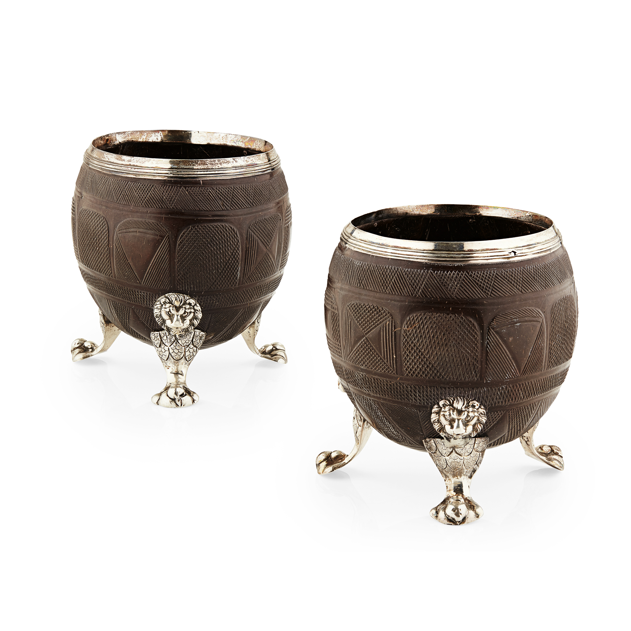 London 1798, the carved coconut shell bodies with geometric panel decoration, applied reeded rim and three lion mask and paw feet (2)