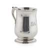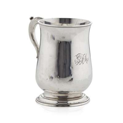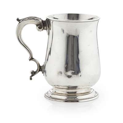 Thomas Wynne, London 1777 of baluster form, simple line decoration to rim, leaf clasped scroll handle. Engraved initials and all on a circular spreading foot.