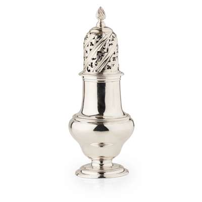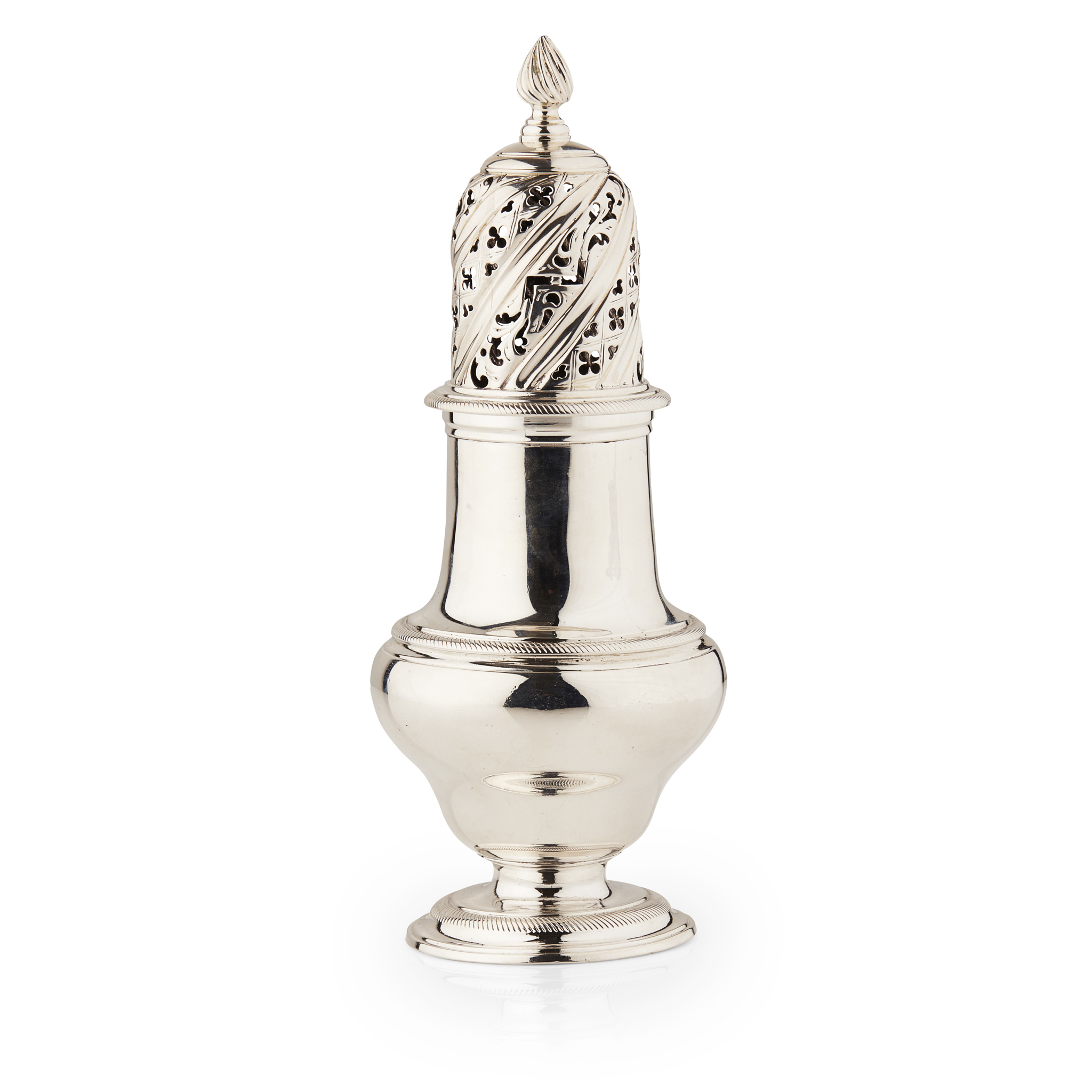 John Delmester, London 1759, of typical baluster form with corded rims and girdles, raised on a stepped foot, the domed pull off cover with wrythen and pierced decoration