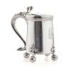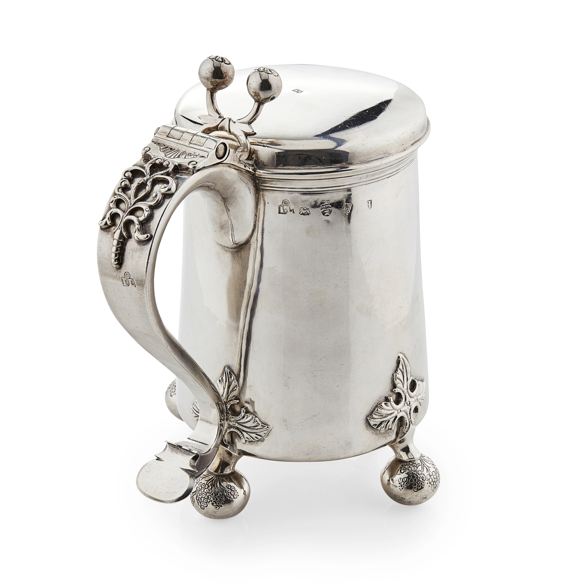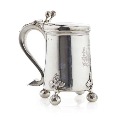 John Langlands, Newcastle 1747, the tapering cylindrical body with engraved foliate scrolling cartouche with intertwined initial and crest above, the whole raised on three compressed ball feet with foliate terminals and fruiting vine details, with bold S scroll handle with cast thumb strap work and hinged cover with foliate detail to ball thumbpiece
