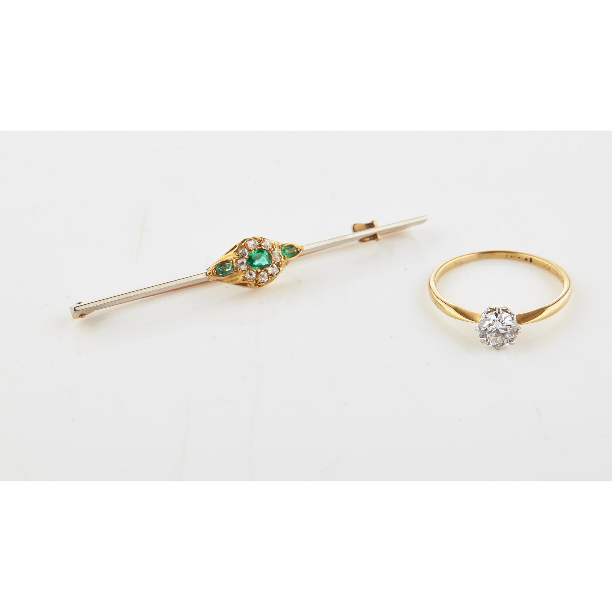 claw set with a single round brilliant cut diamond, to a plain yellow metal shank; together with an emerald and diamond cluster set bar brooch (2)
