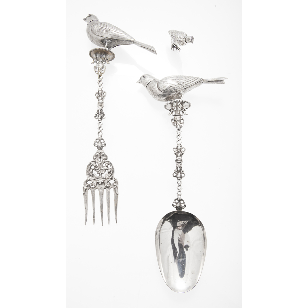 various marks, the terminal modelled as a large standing bird, removable heads, cast decorative stem, ornate tines, the bowl engraved, together with a bird ornament (3)