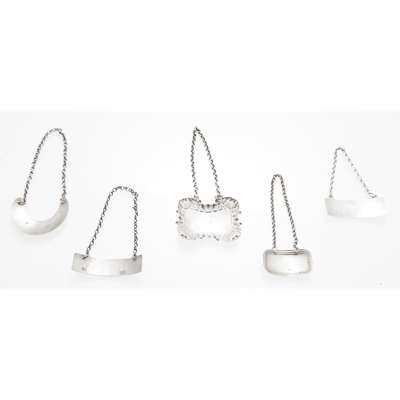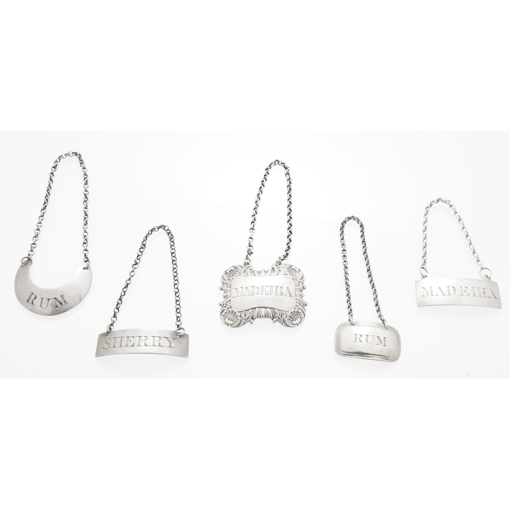 MK conjoined, thistle and duty head, of curved rectangular form, engraved Madeira; W.B only, of similar curved form, engraved Sherry; W.r twice, of curved crescent form, engraved Rum; DM only, of rounded rectangular form, engraved Rum; P.G only, of stamped form, shell and gadroon border, engraved Madeira (5)