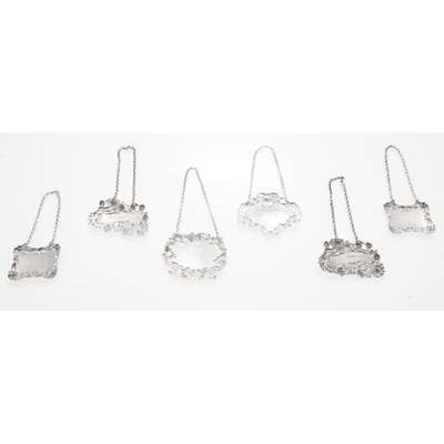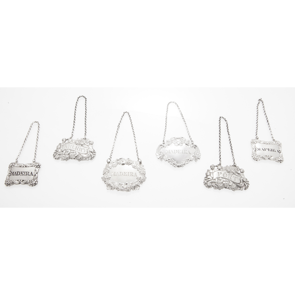 two similar by William Marshall, Edinburgh circa 1800, of stamped form, engraved Madeira; a matched pair JH - AC, circa 1800, rectangular stamped form, engraved Madeira; a pair of stamped form, scrolling label engraved Sherry and Port, the border of winged putti (6)