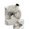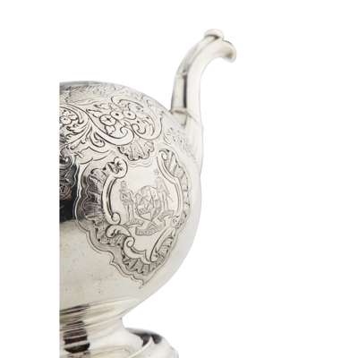 Charles Duncan, maker, Archibald Ure, assay master, Edinburgh 1737, of traditional form, well chased band to the body and the hinged cover, ball finial, the body with scroll cartouches, engraved crest, motto and armorial, curved spout, all raised on a stepped pedestal foot