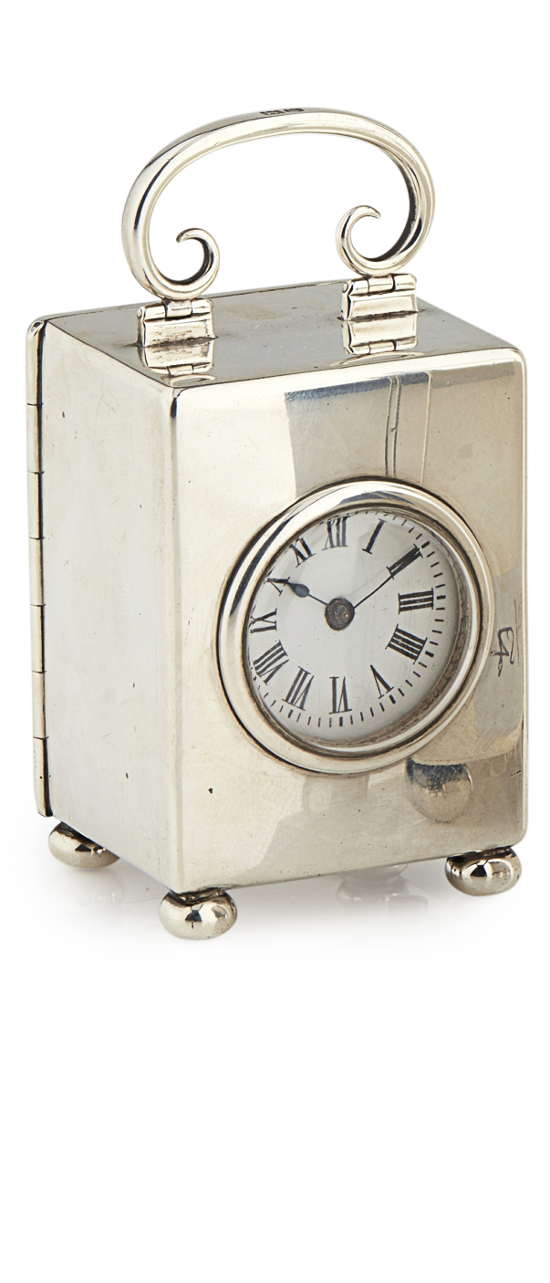William Comyns, London 1898, plain polished case, swing handle, white dial with Roman numerals, all on ball feet