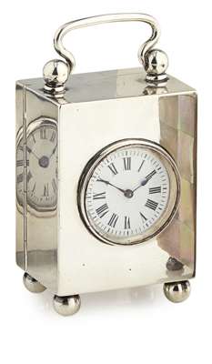 Birmingham 1896, plain rectangular case, fold down handle, circular white enamel dial, Roman numerals, all on ball feet