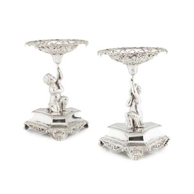 The Barnards, London 1885, the circular trellis work basket with vine leaf and grape decoration, held aloft by a putto kneeling on a concave triform base, leaf and scrolling borders, shell bracket feet