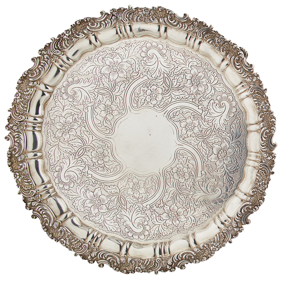 S C Yonge and Co. Sheffield 1819, of circular form, bold cast scrolling rim, chased flat with scrollwork and foliate detail, blank centre, all raised on decorated bracket feet