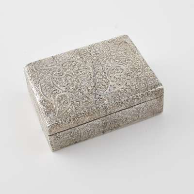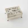 the hinged lid with embossed trailing dragon motif, plain sides, all on claw and ball feet, together with a small table box, allover engraved decoration (2)