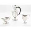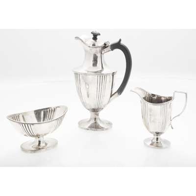 WC, London 1796, comprising a water pot, sugar basin and cream jug, of oval form, threaded border, ribbed sides, oval pedestal foot