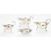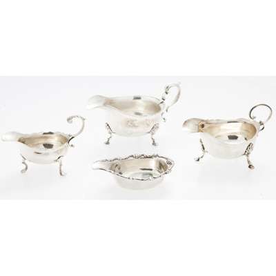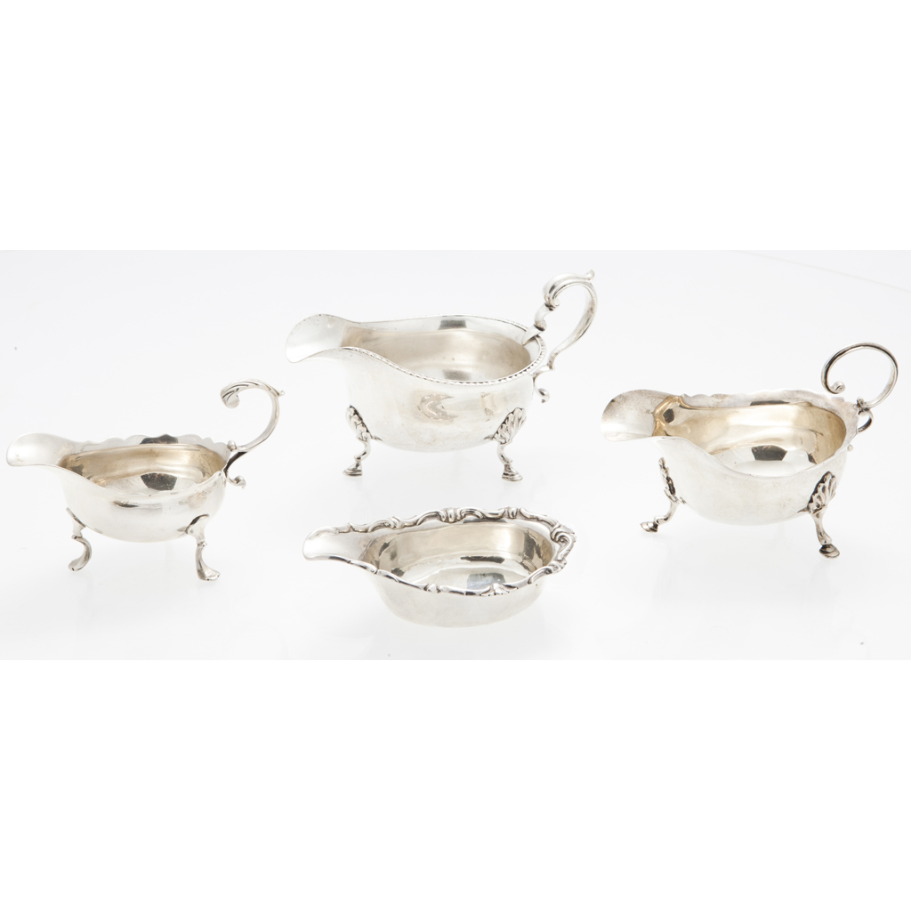 the two sauceboats modern, one with gadroon rim, the other of wavy form; the cream boat, London circa 1790, wavy rim, all on three cabriole legs hoof and webbed feet; the pap boat, London 1857 (qty)