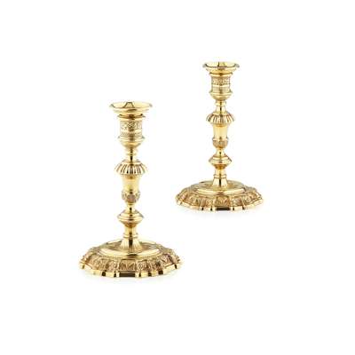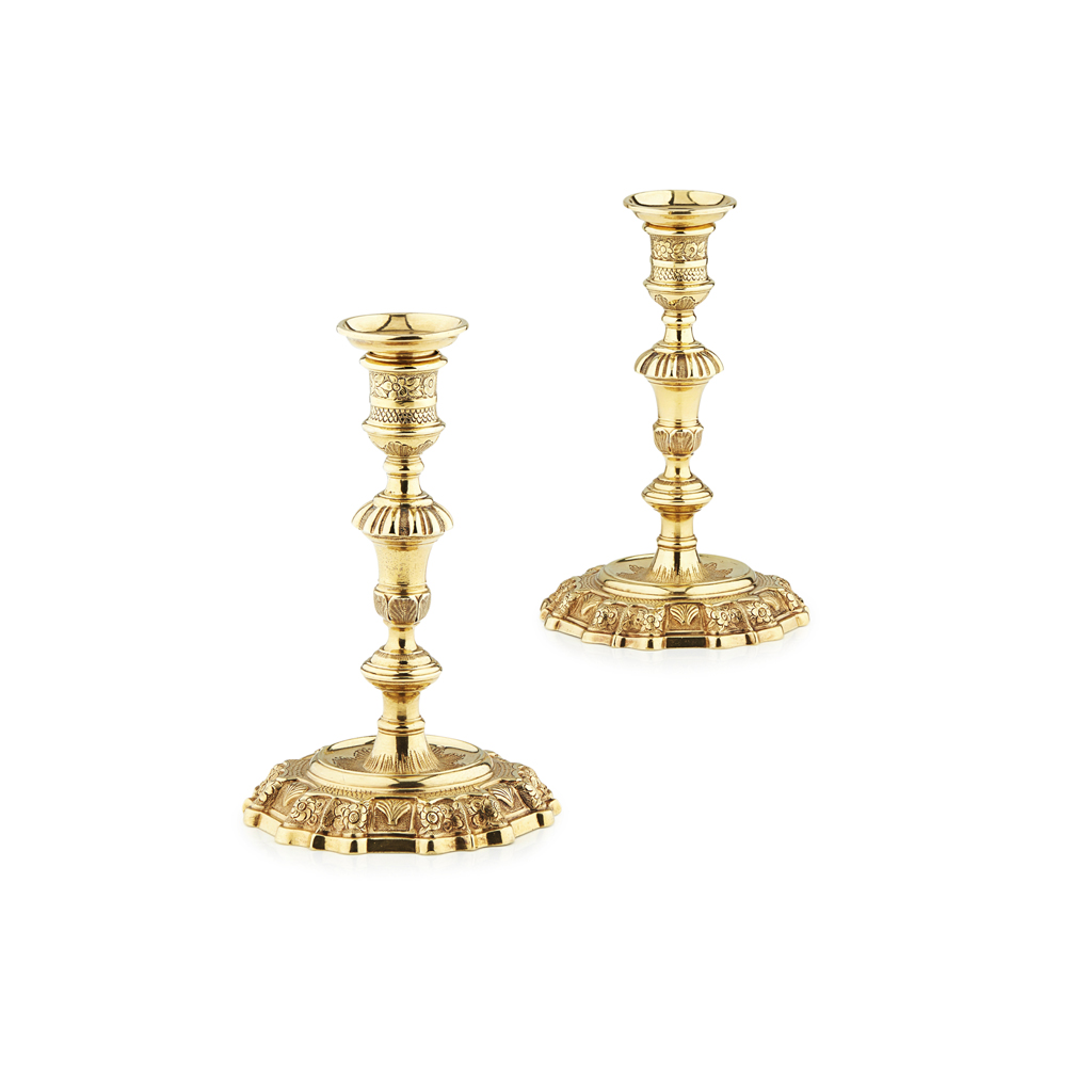indistinctly marked for London circa 1770, chased floral decorated socket, knopped stem onto a shaped lobed circular foot, chased fish scale ground, shell detail, later Victorian sconces