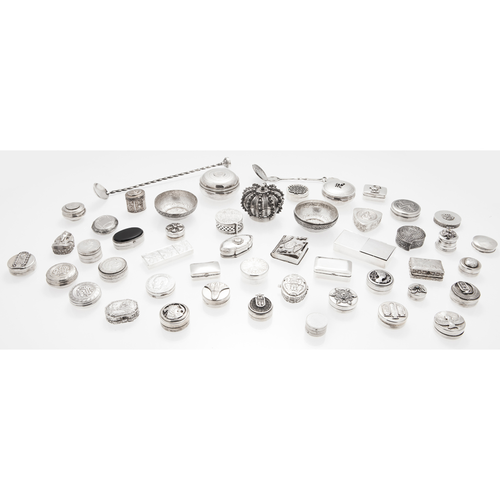 mainly foreign, various marks, 800, 925 etc, all shapes, for pills, snuff stamps etc, decoration varying form plain to heavily chased, some formed from coins as the tops and bottoms, with two spoons (qty)