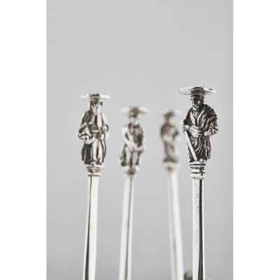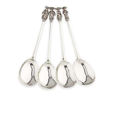 IB, possibly circa 1750, fig shaped bowls with drop and leaf decoration to the back, plain stem and with the apostles St Mathias, St. Peter, St Simon and another, each nimbus with a dove (4)