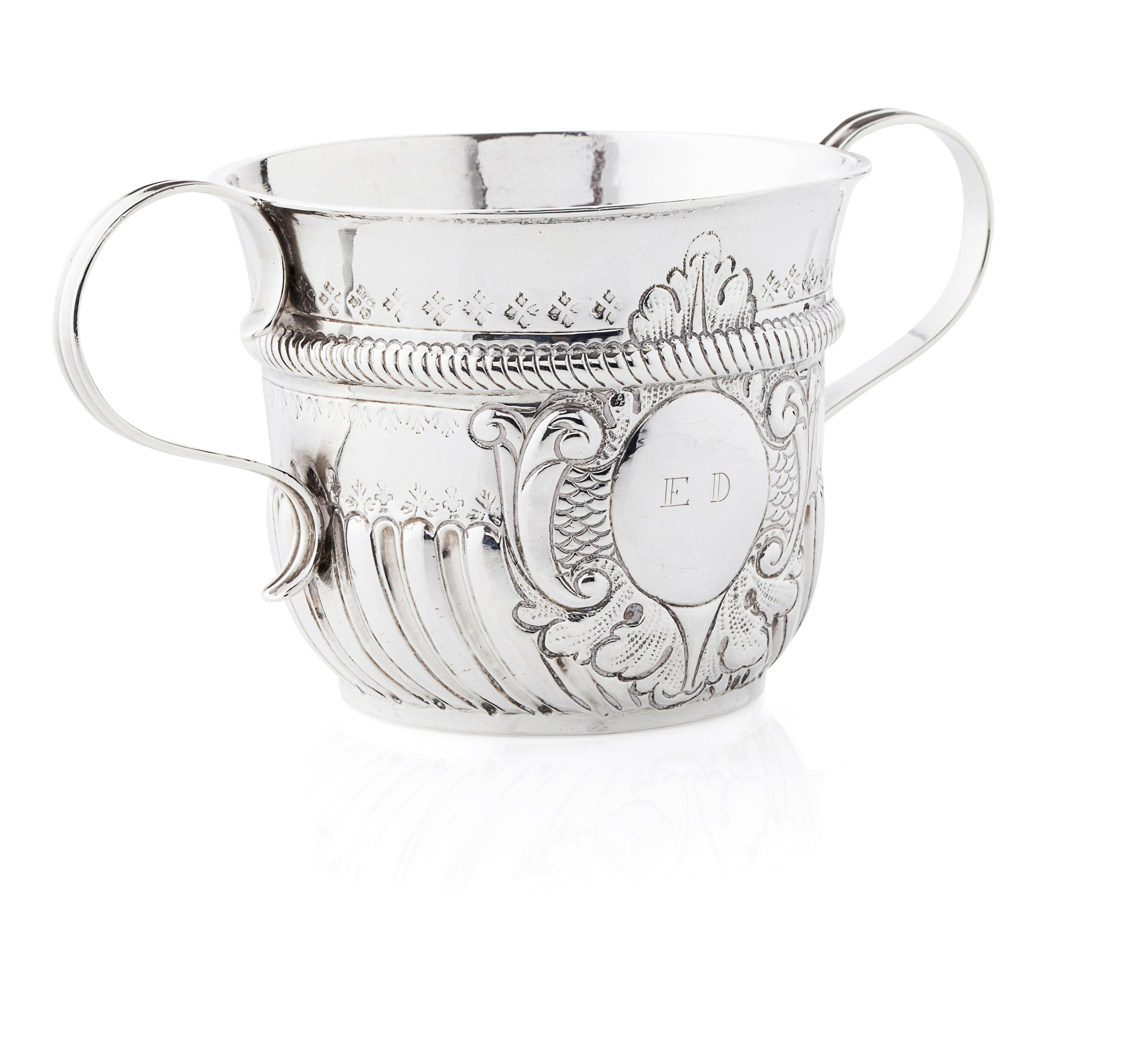 William Fleming, London 1716, of traditional form, threaded scroll handles, ribbed border, oval cartouche with initials, demi wrythen body