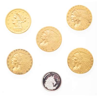 1908, 1914, 1914, 1915, 1906; together with a platinum proof coin, 1996 Unicorn (6)
