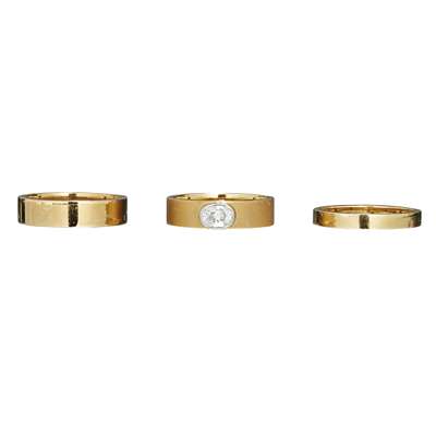 A & A Edinburgh, to include a matte finish band collet set with an oval cut diamond, accompanied by two plain bands of polished finish (3)